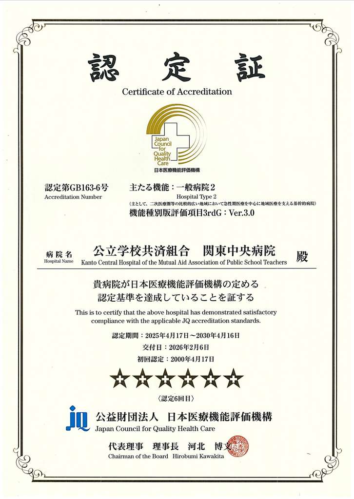 関東中央病院は、第三者評価として (公財)日本医療機能評価機構が実施している病院機能評価の更新審査を受審し、所定の認定基準を達成していると認められ、令和8年2月6日付けで認定病院(一般病院2 3rdG:Ver.3.0)として更新されました。
