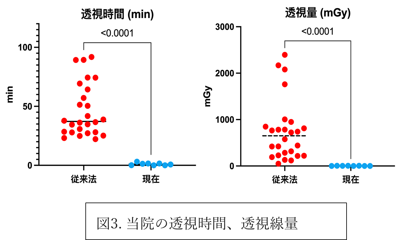 その他の特徴として、被曝量軽減を重視しています。2023年以降は従来の2%以下にまで被曝線量を軽減できています(図3)。患者さんによっては被曝なしで治療を受ける方もおられます。